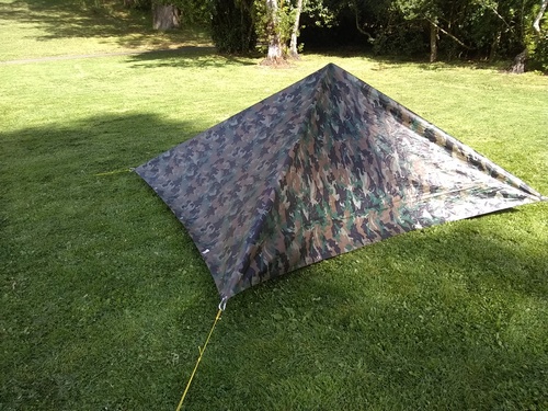 This is a floating enclosed pitch using guy lines; in hot weather the gap would allow ventilation to prevent condensation inside the tarp. I might include a 1 to 1.5 ft. pole I could prop up and tie off as an open door for egress. I'll have to remember to keep a small towel to wipe morning dew off the tarp before folding and rolling it up...