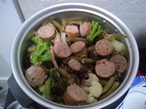 The unseasonable chill in the Bay Area right now is supposed to ease by the middle to the end of next week, but meanwhile, I'm not really feeling it with cold salads, so I'm trying a hot steamed variation - Spinach, Broccoli, Cauliflower, Green Beans, Black and Red Beans, Mushrooms, and Sausage...